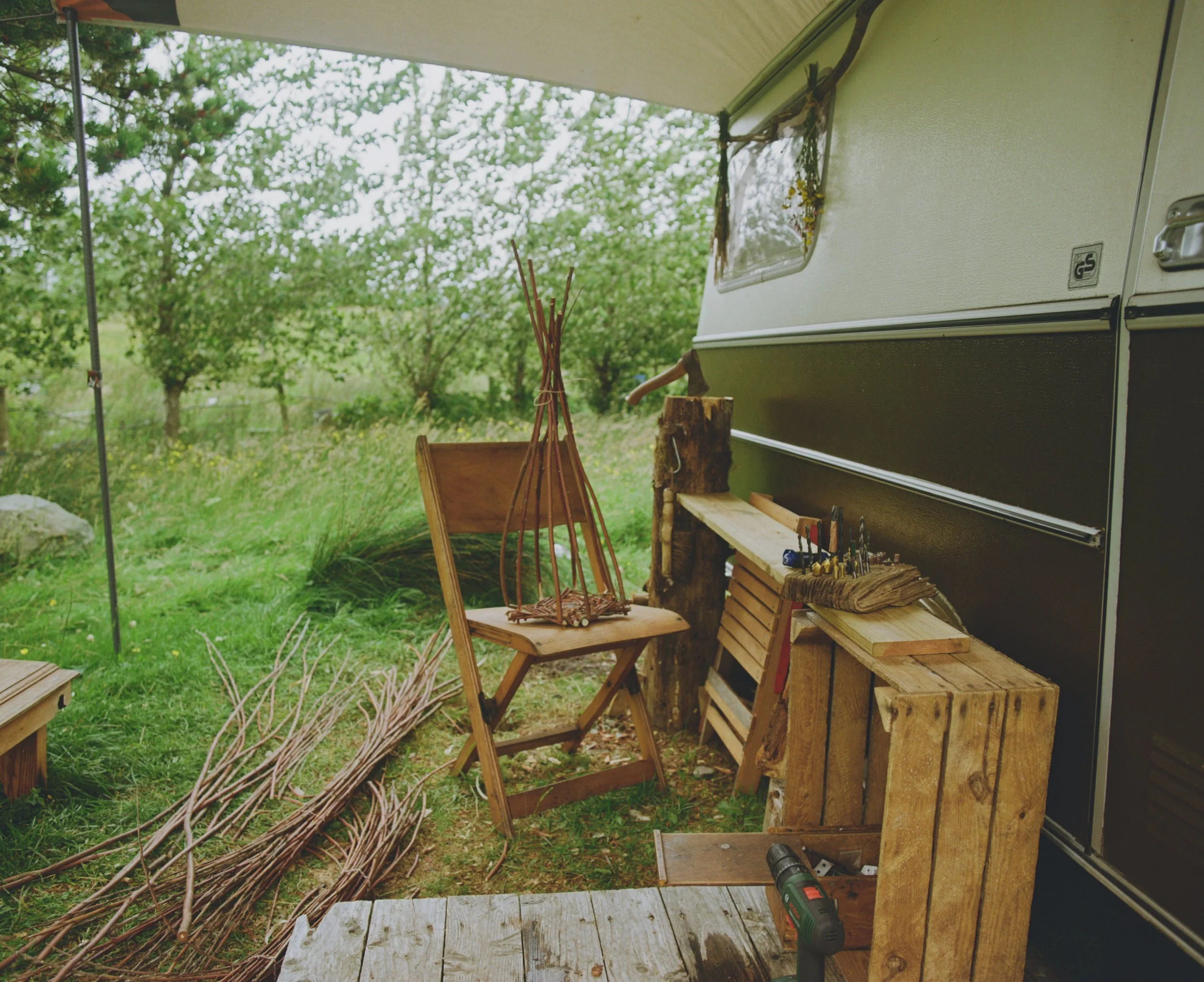 My previous post was set in the depths of winter, with snow on the Isle of Skye. Now I’m going to throw you around a little bit until you land in late summer, last year. It’s pretty handy for me looking back on these shots today…. it feels like winter will never end at the minute. I can’t remember the grass being that long, or seeing little flowers in it, or leaves on the willow trees, let alone a spittle bug. I feel like I’ve been in the caravan for days, hiding from wind and rain… I can’t fathom that there was a time when I sat outside trying my hand at weaving a willow basket, or feeling confident enough to have my loom outside without it getting soaked.